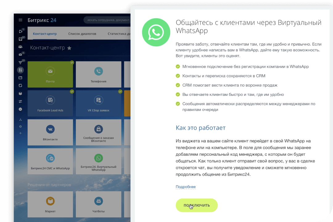 Клиент зашел на сайт и у него остались вопросы? Предложите ему связаться с вами через WhatsApp. Мессенджер уже доступен для выбора в виджете Битрикс24  вам не нужно ничего настраивать.